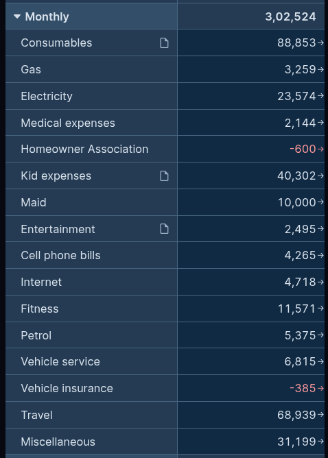 You will notice that two expenses have exceeded their allocated budget. They are “vehicle insurance” and “homeowner association” related expenses. Increase in both those expenses were not in our control and are just inflationary. More details can be found in the screenshot below. The middle column is the total for the whole year for each category and the last column is the monthly average.