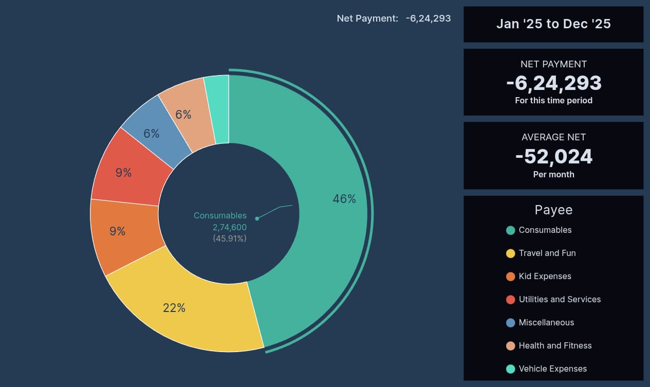 The budget for 2025 was Rs. 75,000 per month. Our average monthly expenses were Rs. 52,336 which like every year, since our retirement, is below the budget. First let’s take a look at where we were spending (see picture below).